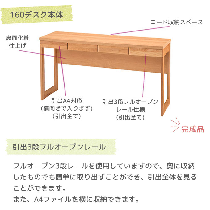 ■商品仕様 サイズ(cm) W160.4×D49×H71 天板中央部分:奥行49 天板端部分:奥行46.3 仕様 材質/天板:強化プリント化粧合板 背板・引出下補強板:プリント化粧合板 脚・引出前板:アルダー天然木 塗装/ウレタン塗装 ○完成品 ○裏面化粧仕上げ ○コード収納スペース ○フルオープン3段レール 国内生産 ※天板手前がゆるくカーブしています。